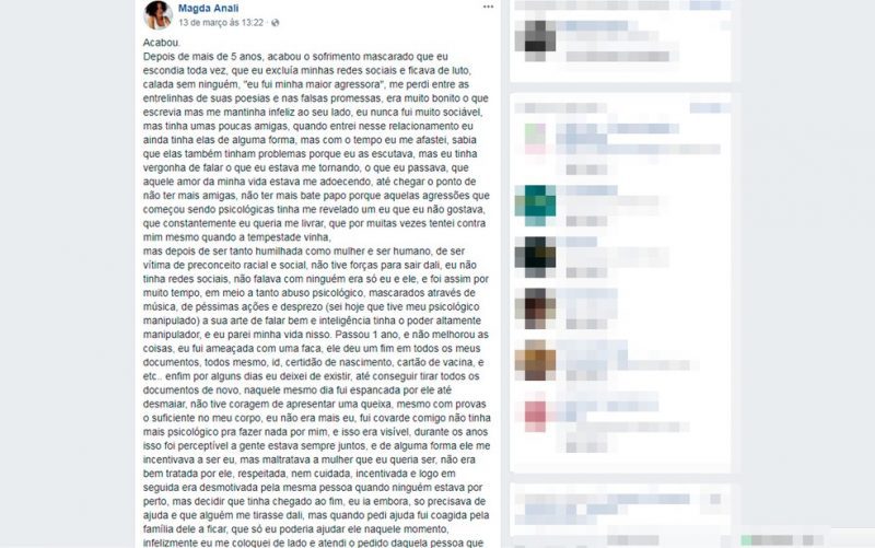 No mesmo dia que registrou o caso, Magda publicou um desabafo na página dela no Facebook no qual relata que, além de ter sido agredida fisicamente mais uma vez, sofreu diversas agressões psicológicas, preconceito social e racial. A publicação teve, até a tarde desta sexta-feira (16), quase três mil curtidas e mais de 800 compartilhamentos.