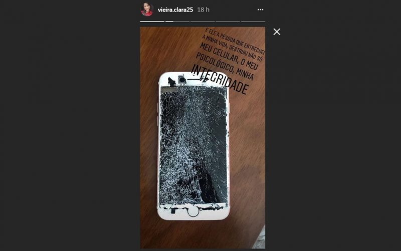 Na conta de Clara no Instagram, ela conta, por meio dos Stories, que o celular dela foi destruído pelo ex-companheiro. “Esse celular foi presente de meu pai e ele (ex-companheiro) a pessoa que entreguei minha vida, destruiu não só meu celular, meu psicológico, minha itegridade”, diz a publicação.