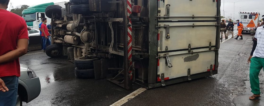 Um caminhão tombou na manhã desta segunda-feira (23), na BR 324 na região de Simões Filho, causando grande congestionamento no local.