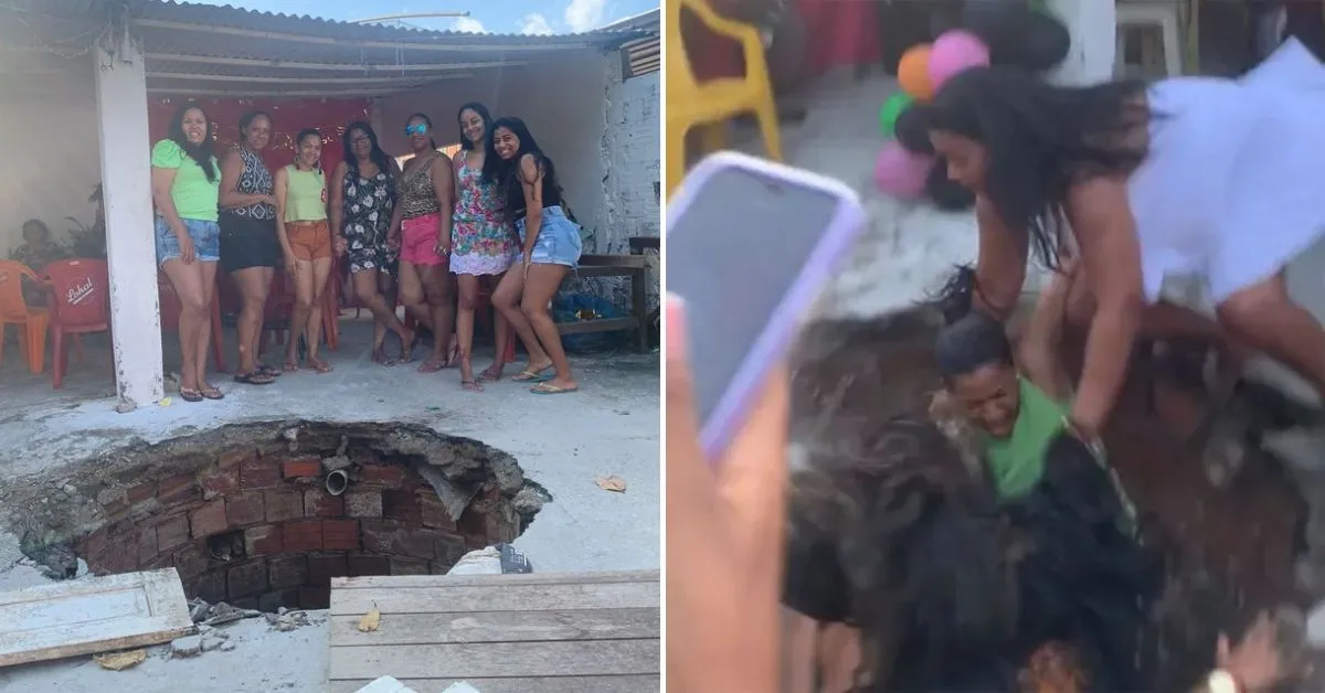 Nas imagens, as mulheres estavam abraçadas, dançando e pulando ao som do hit “Tem Cabaré Essa Noite”, quando parte do chão que cobre uma fossa, que era desconhecida pelo grupo, cedeu.