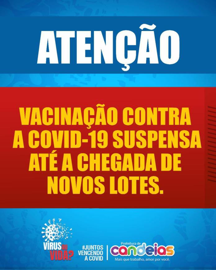 A Prefeitura de Candeias, através da Secretaria de Saúde, informa que a vacinação contra a COVID-19 está suspensa para todos os públicos até a chegada de novas doses de imunizante.