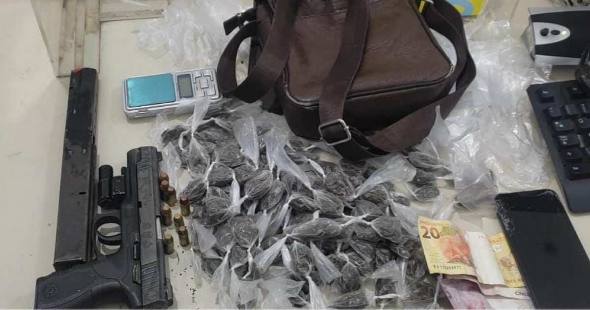 Os policiais receberam uma denúncia de que um indivíduo estava portando uma arma de fogo. As guarnições iniciaram as buscas e encontraram o suspeito. Com o homem, eles apreenderam uma pistola, um carregador alongado, munições, uma balança de precisão, embalagens, 142 porções de maconha e dinheiro em espécie.