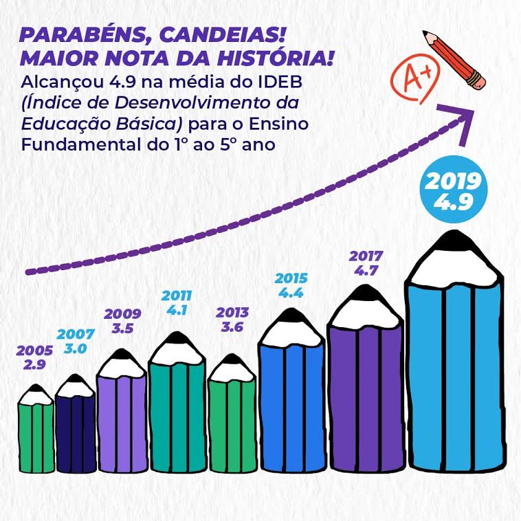 Pela primeira vez na história do município de Candeias, a Educação alcançou um crescimento de 22%, no Índice de Desenvolvimento da Educação Básica, o Ideb. A avaliação foi divulgada na terça-feira (15), pelo Instituto Nacional de Pesquisa Educacional Anísio Teixeira (Inep). O crescimento foi gradual para o Ensino Fundamental (anos iniciais), ensino que abrange do 1º ao 5º ano, subindo para 4.7 em 2017 e saltou para 4.9 em 2019.
