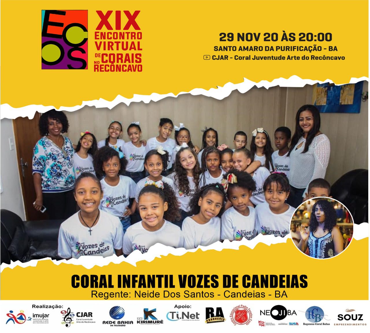 Dia 26 de novembro, o Coral Asa – Terceira Idade será uma das atrações, já no dia 27 Candeias vai apresentar para o mundo o Coral Municipal, e dia 29 será a vez do Coral Infantil Vozes de Candeias. O ECOS 2020, será transmitido pelo youtube e nos dias 28 e 29 de novembro, a transmissão também será feita pela TV KIRIMURÊ para toda região metropolitana de Salvador.
