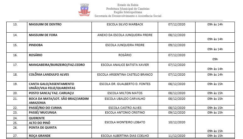 A Prefeitura de Candeias, por meio da Secretaria de Desenvolvimento e Assistência Social (Sedas), anunciou o cronograma da distribuição dos tickets das cestas natalinas na sede e nos distritos. Começa no dia 4 e segue até 11 de dezembro, inclusive no sábado, exceto no domingo. O cadastramento será feito com base no banco de dados do Cadúnico, dos usuários inscritos no Bolsa Família.