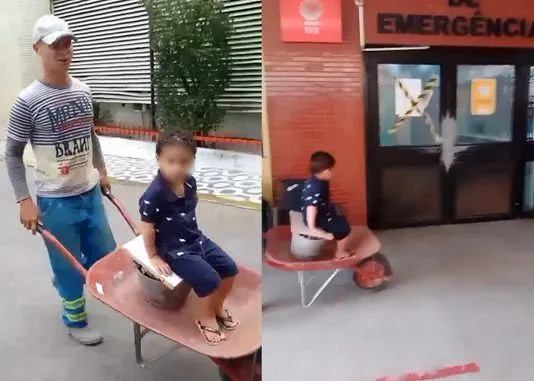 Uma imagem curiosa deu o que falar na cidade de Madre de Deus, na região Metropolitana de Salvador, nesta terça-feira, (16), quando um pai transportava o filho num carrinho de mão para o hospital municipal.