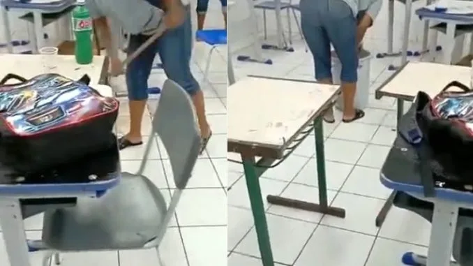 Elas puxaram as mesas e cadeiras, e mostraram o piso sujo. Sem equipamentos de proteção individual, as alunas fizeram a higienização da sala.