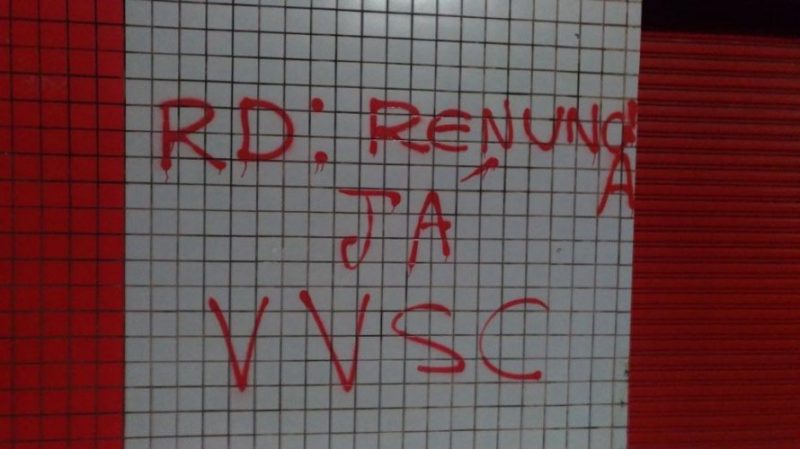 No protesto, o muro foi manchado, com spray de tinta vermelha, com a frase “RD: renuncia já. VVSC [sic]”.
