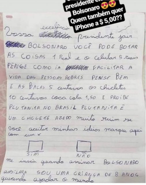 Entre as propostas da pequena Lara está “botar as coisas por um real e o celular custar cinco reais” o que, segundo ela, vai “facilitar a vida das pessoas pobres”. No final de sua carta, a garota ainda pede uma resposta do presidente: “se você aceitar minhas ideias, marque aqui com um x”.