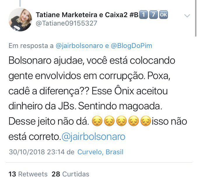 “Não estou arrependido de ter votado em Bolsonaro, porque nada é pior ou mais corrupto que o PT, mas to puto por ele estar trazendo ao governo alguém corrupto como Alberto Fraga condenado por propina”, diz um usuário do Twitter. “Eu votei no Bolsonaro. No entanto, leigo sabe que essa junção de meio ambiente com agricultura vai dar merda”, diz outro.