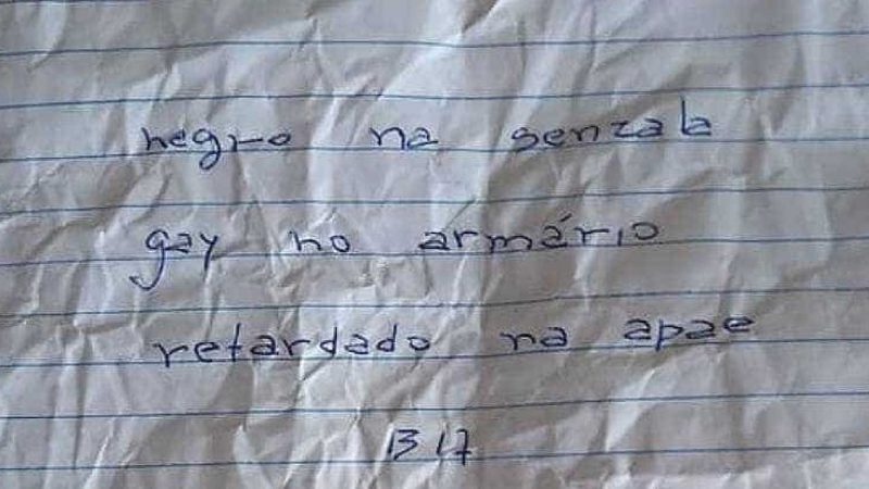 No dia 24 de outubro, a veterinária Daniela Pimentel Chaves, 43, estava na sala de casa, preparando a mochila para a filha ir à escola, como todos os dias. O marido fazia o almoço na cozinha e a menina, de 8 anos, se arrumava no quarto. Ela parou quando encontrou, entre os livros, um pedaço de papel com o recado: “negro na senzala/gay no armário/retardado na apae/ B17”.