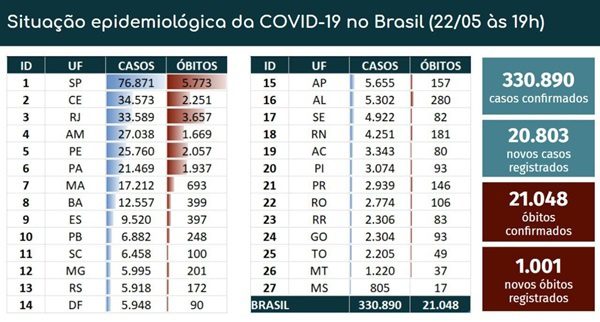 O Brasil teve 1.001 mortes por Covid-19 registradas nas últimas 24 horas e chegou à marca de 21.048 óbitos, no total, de acordo com dados divulgados pelo Ministério da Saúde na noite desta sexta-feira (22/5). É a terceira vez nesta semana que o país passa de mil falecimentos contabilizados em um dia.