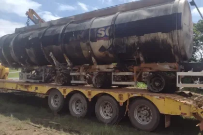 Caminhão-tanque é retirado 48h após pegar fogo no acostamento da rodovia