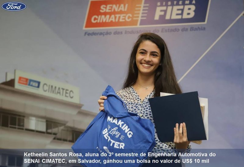 Uma universitária da Bahia está entre os dez estudantes selecionados em todo o mundo para receber o Prêmio Global de Engenharia Alan Mulally 2019. Ketheelin Rios Santos Rosa, 18 anos, aluna do 3º semestre do curso de Engenharia Automotiva do Centro Universitário SENAI CIMATEC, em Salvador, ganhou uma bolsa no valor de US$ 10 mil para custear seus estudos. Durante o evento, realizado no SENAI CIMATEC, também foi feito o anúncio dos três bolsistas que participarão do projeto E2I (Engenharia para Inovação Industrial).