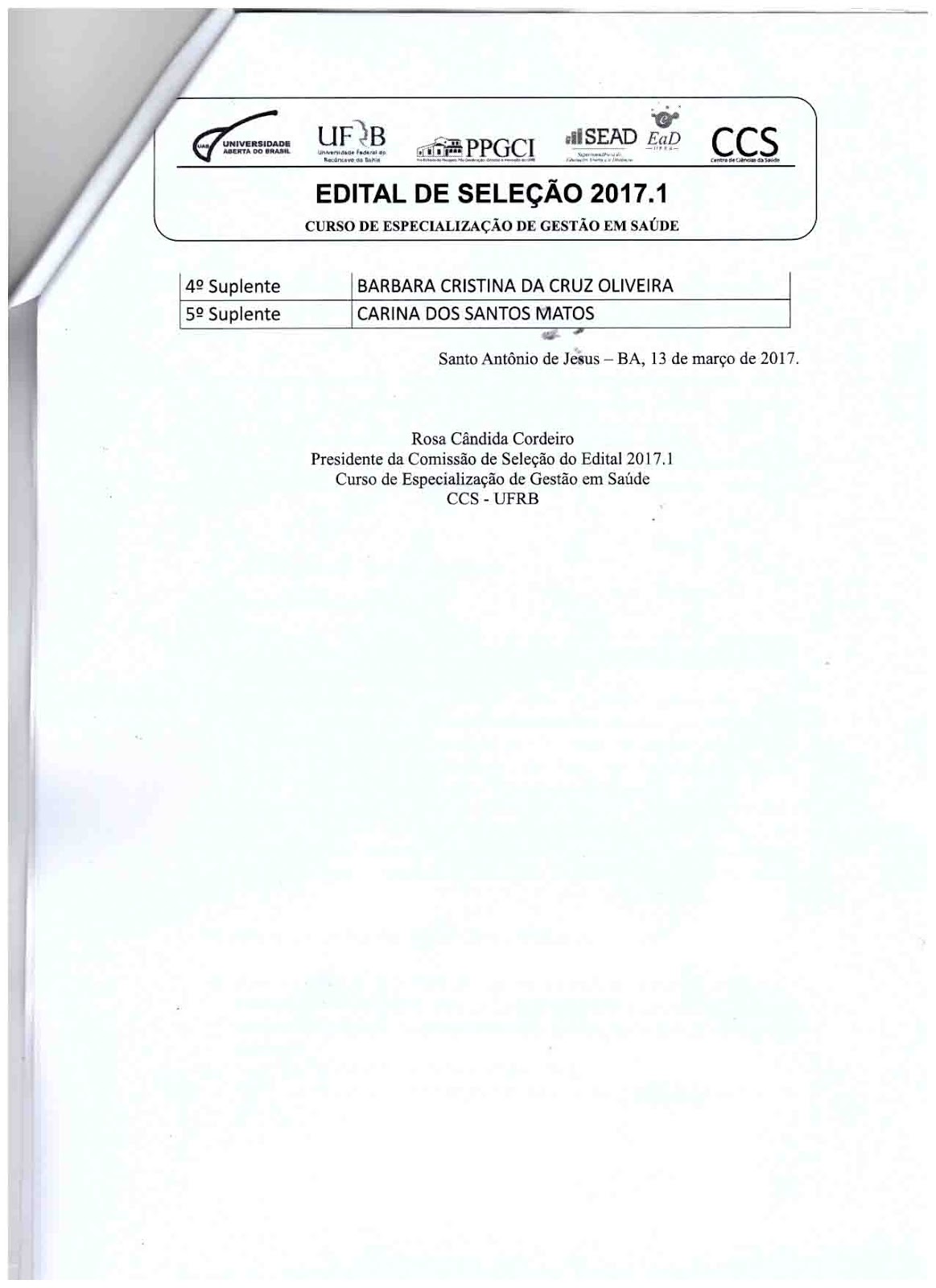 O Polo da Universidade Aberta do Brasil (UAB) em Simões Filho divulgou a lista dos selecionados para Curso de Especialização de Gestão em Saúde, da Universidade do Recôncavo da Bahia (UFRB). Ao todo, foram convocados 50 estudantes.