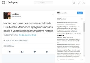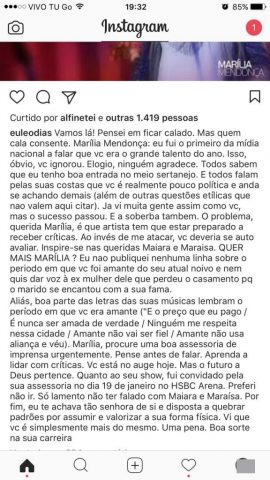 Nós amamos as letras da Marília e muita gente se identifica com as canções da moça que é a sensação do momento. Quando se fala em sofrência o nome dela sempre está na lista, mas a sertaneja viu seu nome envolvido em uma polêmica neste sábado (18/02). O colunista Leo Dias havia feito uma crítica sobre o comportamento da artista nos bastidores do seu show, irritada, Marília rebateu e disse “não respeito o que você faz, nem considero isso trabalho”.