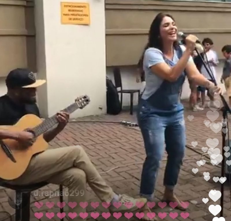 De macacão e sandália rasteira, Ivete animou a galera acompanhada de um dos músicos dela, que tocou violão. O filho Marcelo também desceu para ver o “show” da mãe.