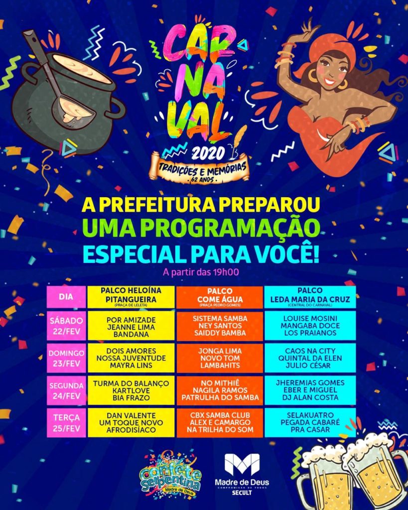 Foi divulgada na tarde desta terça-feira (11), a grade oficial do carnaval Confete e Serpentina de Madre de Deus. Com o tema tradições e memórias, os 62 anos de carnavais na cidade serão comemorados com muita tradição, alegria e historias a serem contadas e lembradas.