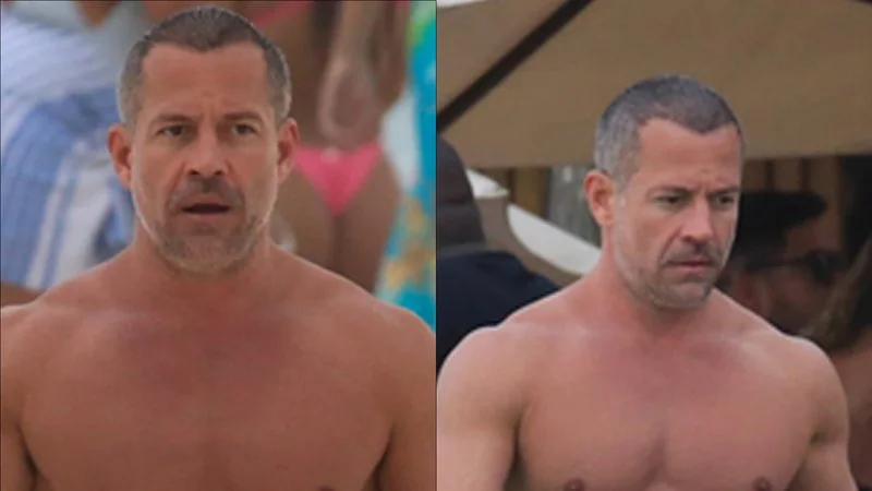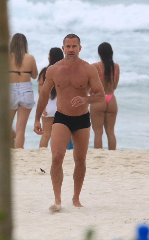 É que o bonitão de 46 anos aproveitou dia de praia para colocar a boa forma para jogo e ostentou músculos definidos em um flagra à beira do mar.