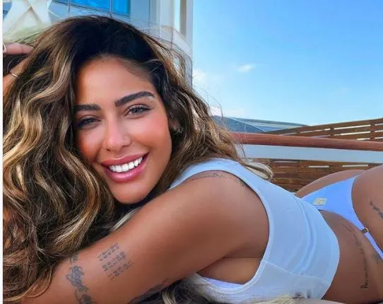 Aproveitando a estadia no Catar, a influenciadora caprichou no clique enquanto renovava o bronzeado na piscina do hotel e não deixou de caprichar na sensualidade posando bem à vontade com um biquíni branco que evidenciou ainda mais o shape escultural da irmã de Neymar!