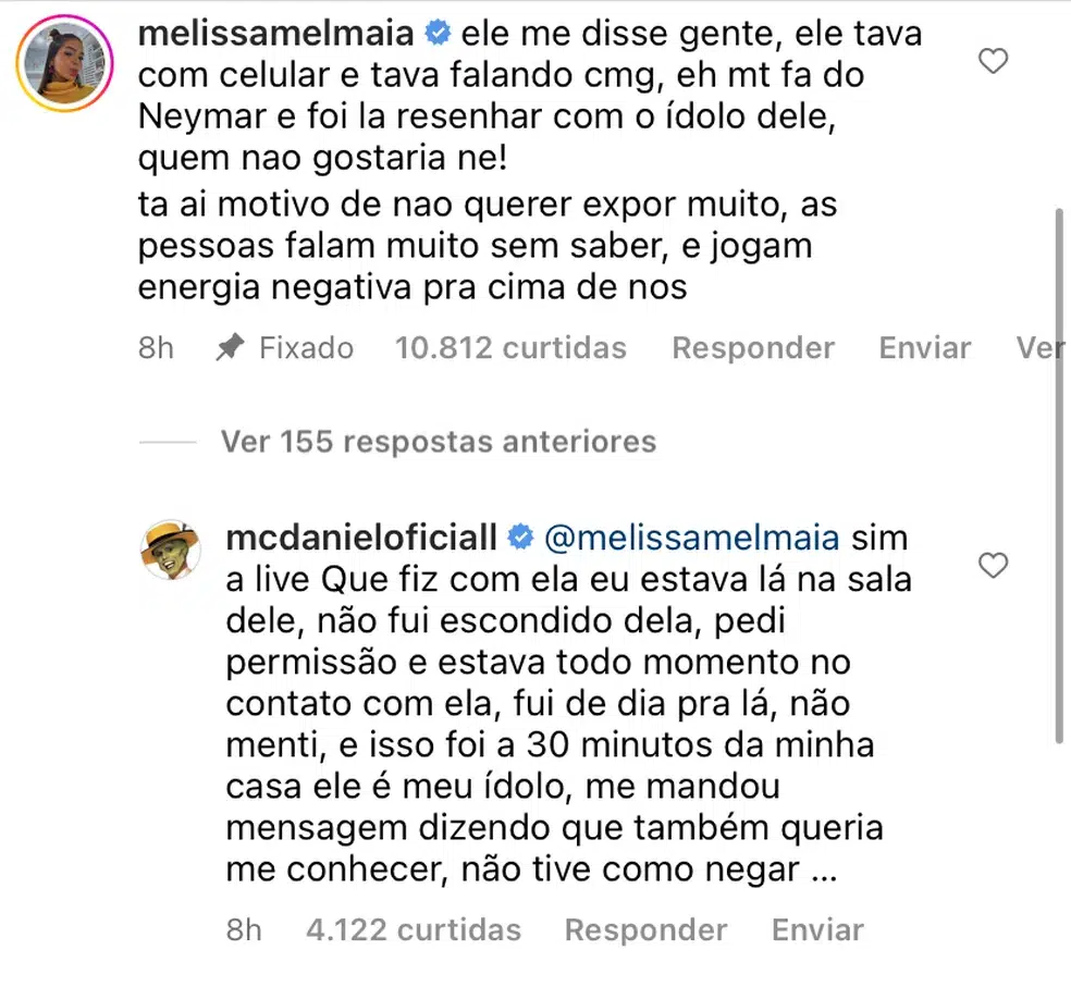 Após isso, o próprio MC Daniel apareceu para falar sobre o assunto. “Na live que fiz com ela, eu estava na sala dele. Não fui escondido dela. Pedi permissão e fiquei em contato com ela a todo momento. Fui de dia para lá, não menti. E isso aconteceu a trinta minutos da minha casa. Ele é o meu ídolo, me mandou mensagem dizendo que também queria me conhecer, não tive como negar”, explicou.