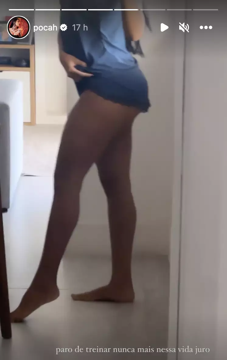 Em uma sequência de vídeos publicados em seus Stories, a cantora e apresentadora surgiu exibindo suas curvas em frente ao espelho, usando um pijama confortável e impressionando com toda a sua beleza natural. “Paro de treinar nunca mais nessa vida”, legendou Pocah.