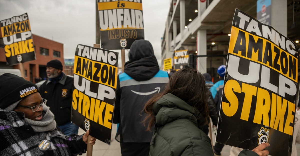 Os trabalhadores da Amazon e membros do sindicato estão em greve nas instalações da empresa em Nova York, Illinois, Califórnia e Atlanta. A greve foi iniciada devido à recusa da Amazon em negociar um contrato de trabalho. A International Brotherhood of Teamsters tem liderado os esforços de organização dos trabalhadores, mas a Amazon não reconhece esses esforços. Os grevistas, principalmente motoristas de entrega, buscam salários e condições de trabalho melhores. A greve é uma das maiores da história da Amazon e já teve repercussões legais, com prisões de motoristas e organizadores. O Teamsters deu um prazo à Amazon para iniciar as negociações, mas a empresa não cumpriu, levando à greve.