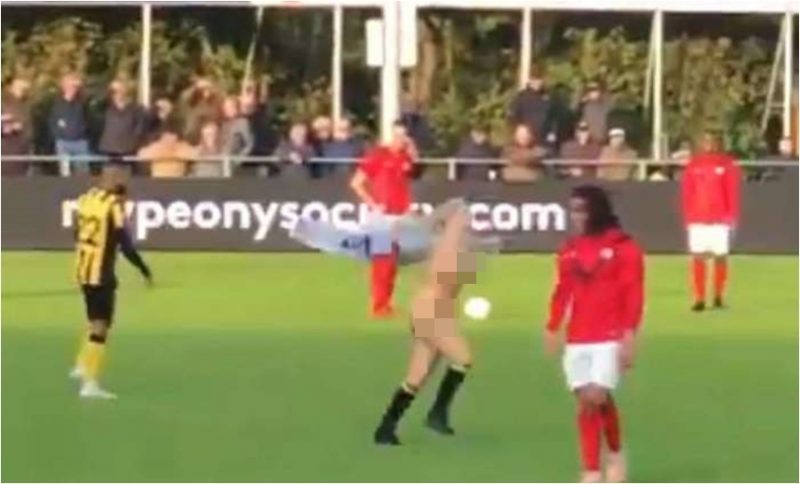Aos 21 minutos de jogo, uma bela torcedora do time local invadiu o gramado completamente nua com uma bandeira de uma torcida organizada do Rijnsburgse Boys. Não satisfeita, ela partiu para cima do meia Joël Tillema, que… acabou se esquivando da beldade.