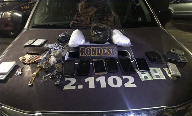 Com “Do Milho”, Luís Henrique Freitas Cerqueira, o “Dan”, 26, Leandro Lima Souza, o “Guegueu”, 24, e Mateus Nascimento Santos, apelidado de “Gordo”, 22, foram apreendidos um colete de uma empresa de segurança, dois quilos de cocaína, meio quilo de maconha, quatro balanças e R$ 325 em espécie.