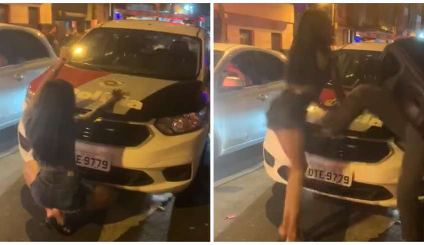 As imagens mostram a jovem fazendo uma performance em frente ao carro da polícia, que estava parado no local de uma ocorrência.