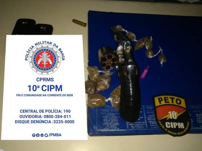 Além do revólver com numeração raspada, os PMs encontraram 2 munições intactas e 4 deflagradas, 2 celulares, 12 buchas de maconha e 1 pino de cocaína.