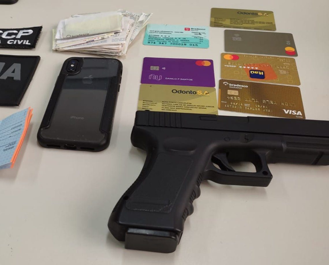 No momento da prisão, foram apreendidos com ele um simulacro de arma de fogo, diversos cartões de crédito, folhas de cheque e um celular com chip em nome de terceiros. O homem foi encaminhado para a Delegacia de Furtos e Roubos onde se encontra à disposição da Justiça.