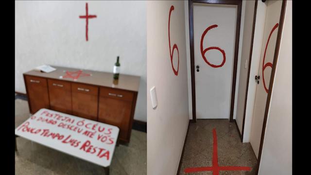 Haviam também cruzes invertidas desenhadas na parede e um recado em uma página da bíblia: “ele me obrigou”.