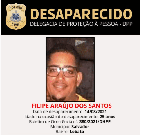 O jovem foi identificado como Felipe Araújo dos Santos. Uma amiga de Felipe disse que ele e a esposa trabalham vendendo pirão. A Delegacia de Proteção à Pessoa (DPP), pelo perfil oficial de desaparecidos, divulgou o boletim de ocorrência de Felipe e disponibiliza telefones para contato.