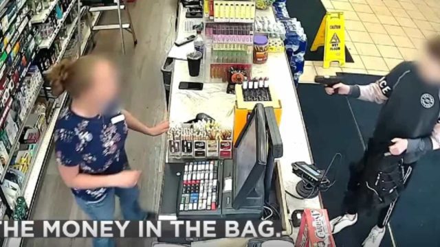 Imagens de videoconferência mostram a criança apontando uma arma à funcionária enquanto exige que esta lhe dê o dinheiro da caixa registadora. Quando a mulher lhe pergunta se ele está falando sério, o jovem responde calmamente que sim, e dispara para o ar. A funcionária dá-lhe rapidamente um envelope com dinheiro, que o menino coloca numa mochila, antes de fugir.
