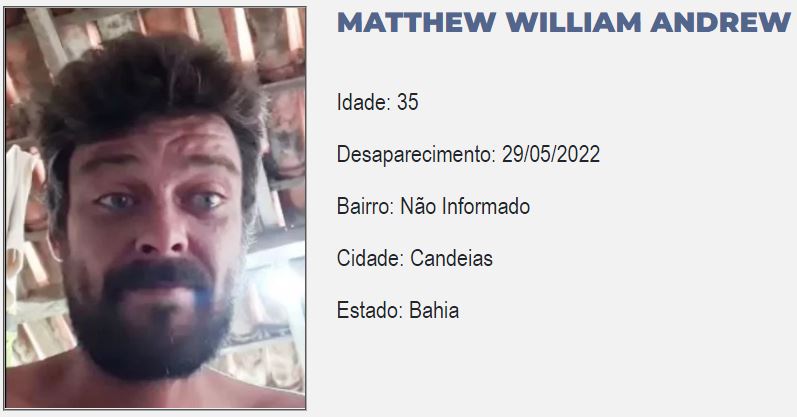 De acordo com a Polícia Civil, a companheira do inglês registrou o desaparecimento no dia 2 de junho na Delegacia Territorial da cidade, que apura o caso. A Polícia Federal informou que Matthew mora no Brasil desde 2013.