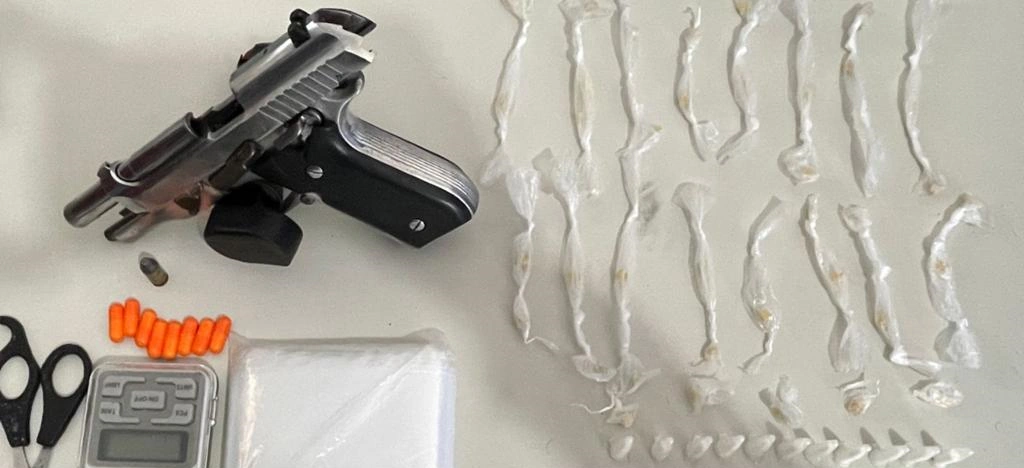 De acordo com a polícia, o homem estava armado com uma pistola calibre 380 modelo 58 HC, além de carregar um carregador com uma munição picotada. Ele também tinha uma mochila contendo diversas drogas, entre elas 22 pinos de cocaína, 36 pedras pequenas de crack, 8 cápsulas de uma substância não identificada, uma balança digital e materiais para fracionamento e embalagem de drogas.