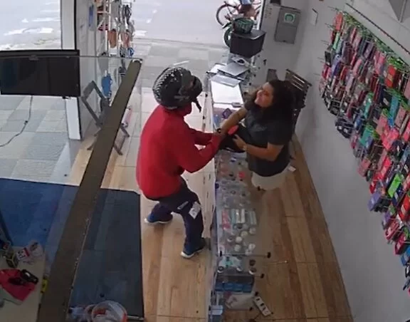 Amanda Silva, de 27 anos, atendia a uma cliente na loja de aparelhos eletrônicos Blue Store, na Vila Margarida, quando o indivíduo, de 51 anos, entrou no estabelecimento usando um capacete de moto e anunciou o assalto. Ele saca a arma falsa, toma os aparelhos celulares das vítimas e os coloca em uma mochila.