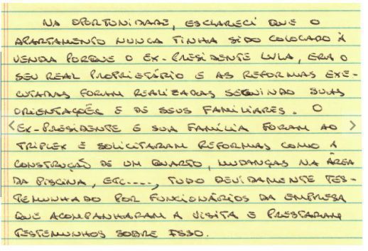 No documento, ele ainda reafirmou o pagamento de propinas ao ex-presidente Lula. Confira abaixo mais um trecho da carta enviada por Léo Pinheiro: “Preciso dizer que as reformas não foram um presente. Os empreendimentos da Bancoop assumidos pela OAS apresentavam grandes passivos ocultos, com impostos, encargos que não deveriam ser assumidos pela OAS. Em paralelo, João Vaccari cobrava propina de cada contrato entre OAS e Petrobras.