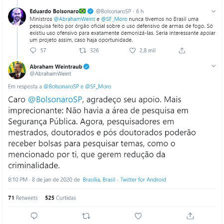 A publicação de Eduardo era um comentário a um tuíte anterior do ministro. Citando Weintraub e o Ministro da Justiça Sergio Moro, o deputado diz que o Brasil nunca teve uma pesquisa feita por órgão oficial sobre o uso defensivo de armas de fogo.