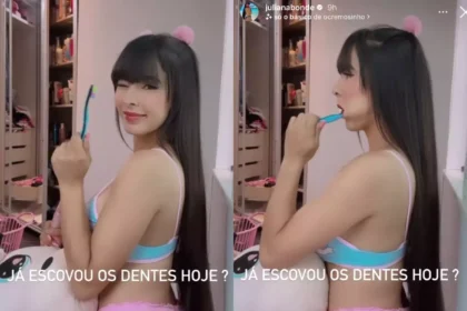 De baby doll no quarto, Juliana Bonde ensina fãs a escovar os dentes: “Colocar bem fundo”