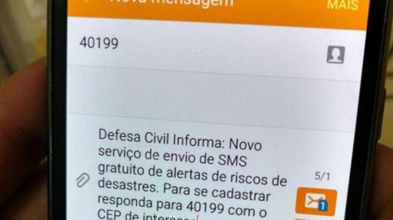 A Defesa Civil Nacional anunciou que vai aderir ao serviço de SMS gratuito de alertas de riscos de desastres que já funciona na Defesa Civil de Salvador (Codesal), desde 2016. As informações são através do Centro Nacional de monitoramento e Alertas de Desastres Naturais (Cemaden) junto com ao Ministério da Ciência, Tecnologia, Inovações e Comunicações (MCTIC).